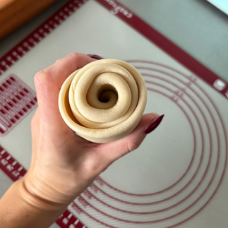 PM seeeeehr fest geworden. Beim Auspacken entläßt er Luft und ist wieder sehr weich. Struktur innen gut. Das erste Mal ein Bagnetto gemacht: 250 ml Wasser (38 Grad) + 0,5 g Zucker. Sehr flache Schüssel (Fehler?!). Teile von PM sind sehr zeitnah direkt hochgegangen, andere lagen bis zum Ende im Wasser. PM defintiv noch zu schwach aber vermutlich auch sehr sauer. 96 g PM (Wasser rausgedrückt, aber sicher ist noch etwas Wasser enthalten), 96 g Mehl und Wasser (nicht direkt dokumentiert, daher vergessen, aber ich tippe darauf dass schon gut 40% drinnen waren). Teig kam sehr schnell gut zusammen und ließ sich sehr gut ausrollen. Zur Schnecke gerollt, Kreuz rein und zu Regenbogen geformt. Ab 21:20 Uhr bei 28 Grad 12 Std. gären lassen.